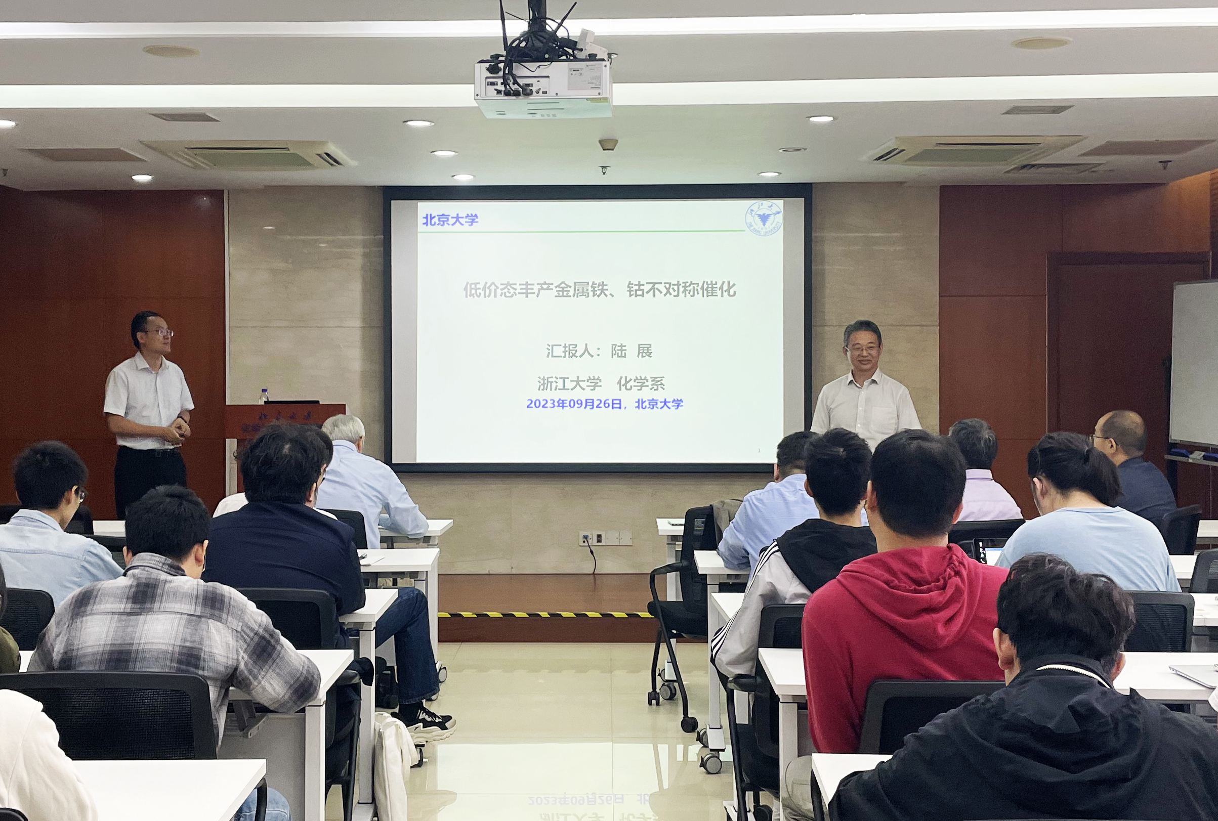 9月26号上午,来自浙江大学化学系的陆展教授应张文雄教授的邀请,来到北大化院为师生们做出了精彩的学术报告。陆教授在麻生明院士的指导下, 2008 年于浙江大学获得博士学位,同年赴美国威斯康星大学麦迪逊分校化学系开展钯催化氧化反应以及可见光催化剂相关研究,2013年回国后任浙江大学化学系特聘研究员,博士生导师,主要从事于廉价过渡金属催化不对称硅氢化反应相关研究。本次报告题目为《低价态丰产金属铁、钴不对称催化》,向大家展示了他近些年在廉价过渡金属不对称催化反应领域内开展的研究和取得的成果。陆教授还在报告中分享了自己在研究过程中的一些思路心得,这令在场师生受益匪浅。报告结束后老师同学们踊跃发言提问,令在场的学术交流氛围愈发浓厚。