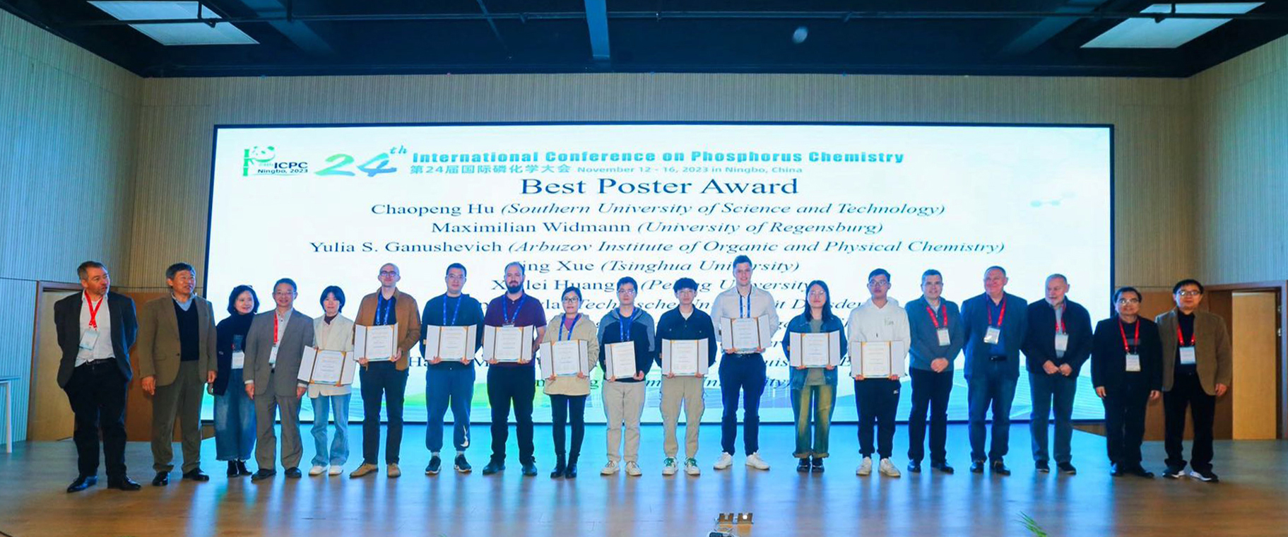 实验室成员参加第二十四届国际磷化学大会 时间:2023-11-21 来源:作者: 字体: 【小】 【中】 【大】 2023 年 11 月 12 日至 16 日,第二十四届国际磷化学大会在中国宁波大学举办。张文雄教授带领部分实验室成员前往参会,与国内外研究磷化学的同行们进行学术交流,并在大会上作关于从白磷直接构筑有机磷化合物的学术报告。 本次会议展示了磷化学领域近期取得的成果,不仅加强了该领域科研人员之间的联系,也促进了该学科的发展。我们研究室参会的成员们围绕白磷活化分别做了墙报展讲,其中皇甫鑫磊同学荣获本届会议优秀墙报奖,祝贺皇甫鑫磊同学!