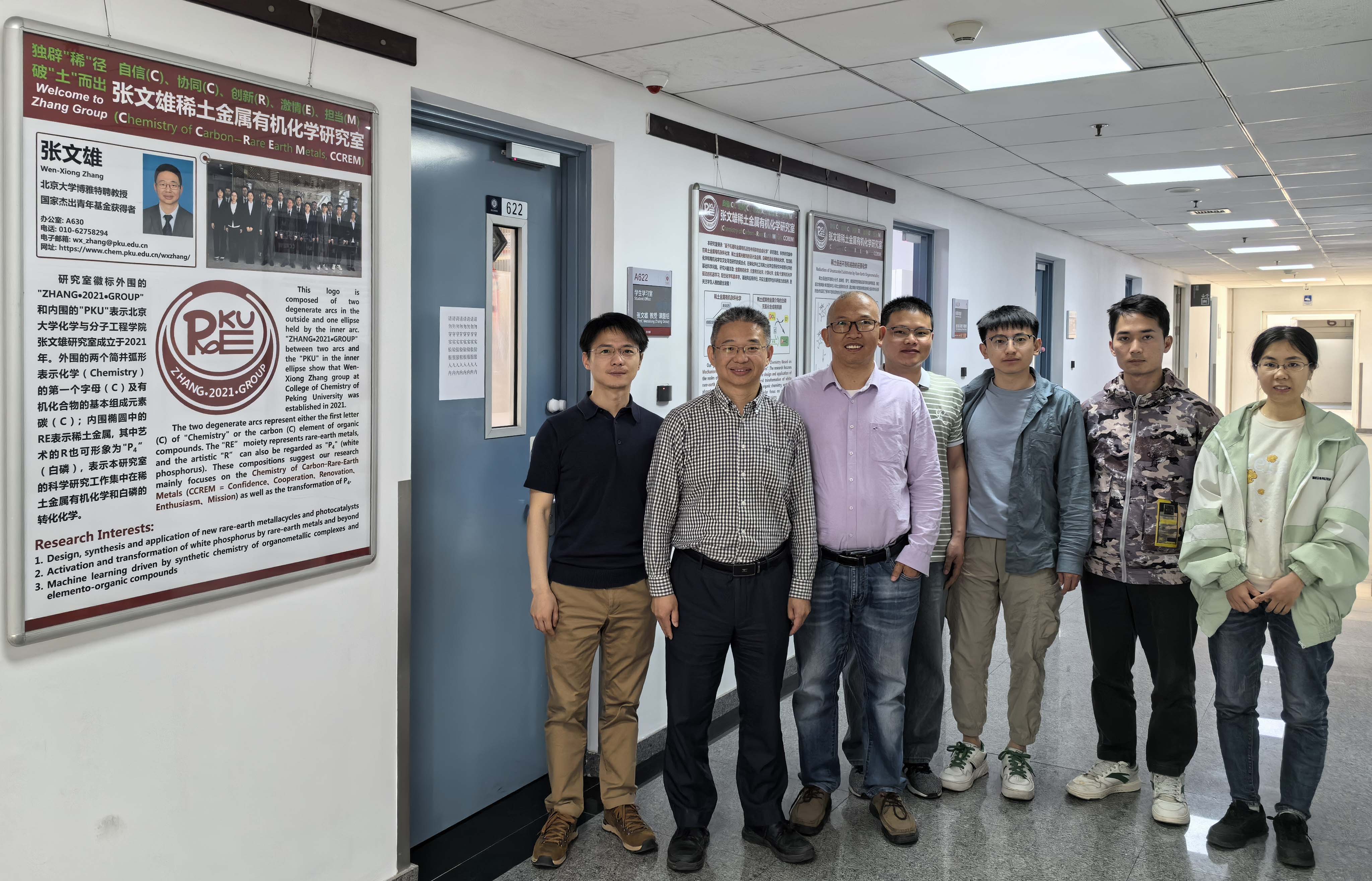 热烈欢迎陈谦教授和胡少伟教授来组访问! 时间:2024-05-14 来源:作者: 字体: 【小】 【中】 【大】 5 月 12 号,西南林业大学陈谦教授和北京师范大学胡少伟教授在张老师带领下访问了我们研究室,他们参观了实验室里的各种仪器设备以及研究室的展板,在张老师热情邀请下大家一起合影留念。陈谦教授目前任职于西南林业大学化学工程学院,他长期从事催化与有机合成、生物质化学与能源、生物质材料与环境等相关领域的研究工作。胡少伟教授目前任职于北师大化学学院,他的研究方向主要为金属有机化学。感谢陈谦教授和胡少伟教授的来访!