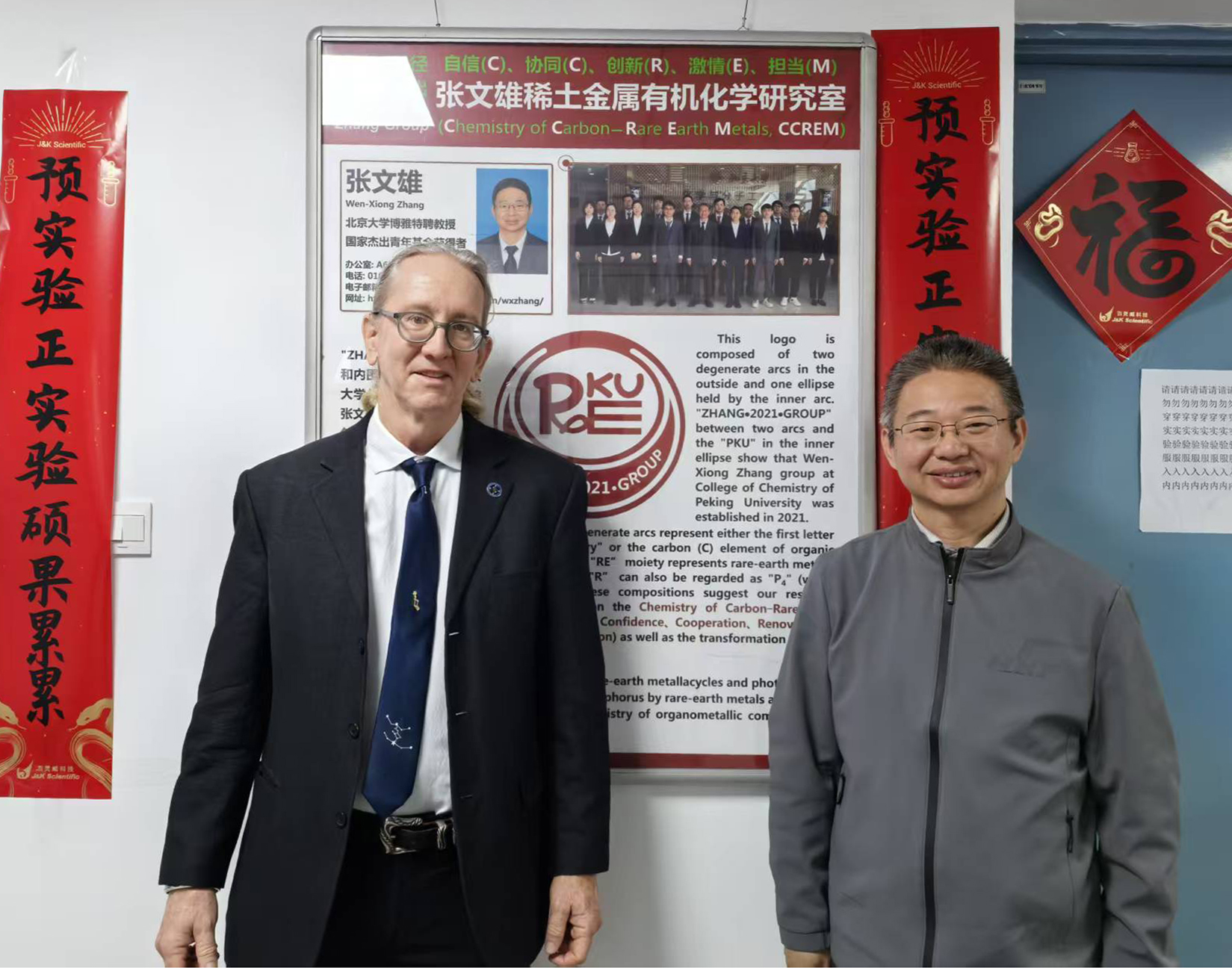 热烈欢迎Patrick J. Walsh教授来组访问! 时间:2025-05-12 来源:作者: 字体: 【小】 【中】 【大】 5月9号,宾夕法尼亚大学Patrick J. Walsh教授受邀来到北大化院进行兴大报告,期间他在张老师带领下参观了我们的实验室,并与张老师合影留念。Walsh教授及其团队在有机、金属有机和无机合成与催化多个领域开展了广泛研究。包括基于有机锌和钛的催化剂、后过渡金属和镧系金属催化剂在碳–硫(C–S)和碳–碳(C–C)键构建中的应用、硫基有机催化剂的开发等领域。感谢Patrick J. Walsh教授的访问!