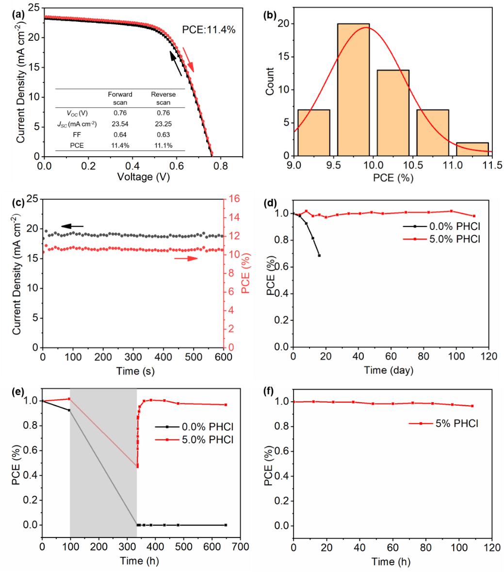 图 1 (a)最佳器件的J-V特征曲线,(b)48个掺杂5% PHCl 的钙钛矿器件的光电转换效率PCE直方图,(c)掺杂5% PHCl 的钙钛矿器件在0.56 V 偏压下的稳态输出光电流和稳定输出功率,(d)掺杂5% PHCl和未掺杂钙钛矿器件在手套箱中的放置稳定性。