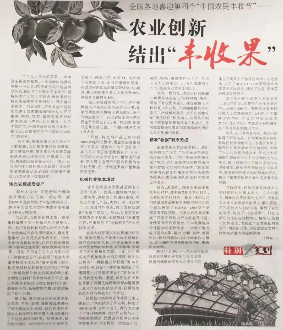 2021年9月29日,《中国知识产权报》刊登了本课题组稀土发光材料及其应用项目组(苏州睿尔思科技有限公司)的转光农膜产品,该报道详细介绍了稀土转光农膜的作用机理、应用效果以及市场前景。